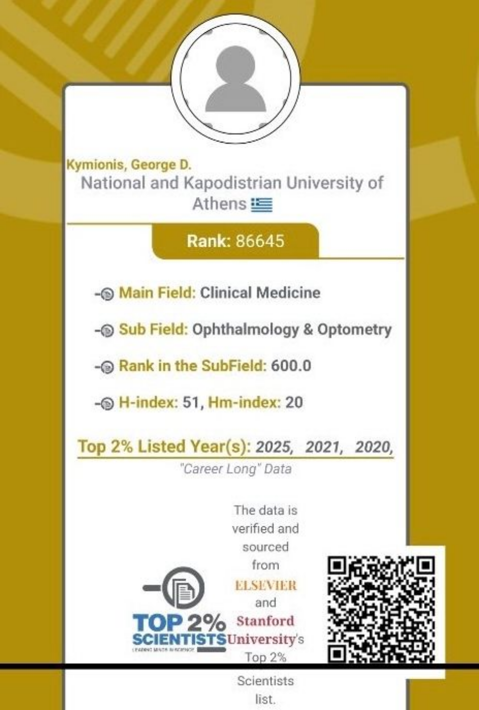 Ο Καθηγητής Οφθαλμολογίας κ.Κυμιωνής συγκαταλέγεται, για τρίτη φορά φορά από το Elsevier Data Repository και το Πανεπιστήμιο Stanford των Η.Π.Α. στο κορυφαίο 2% της κύριας ειδικότητας τους.